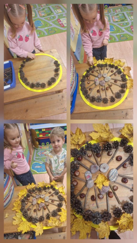 Ruduo kuria paveikslus gamtoje, o vaikai – grupėje. Mandalų dėliojimas ne tik ramina, bet ir skatina kūrybiškumą – ugdytiniai mėgavosi procesu ir grožėjosi sukurtais darbais.