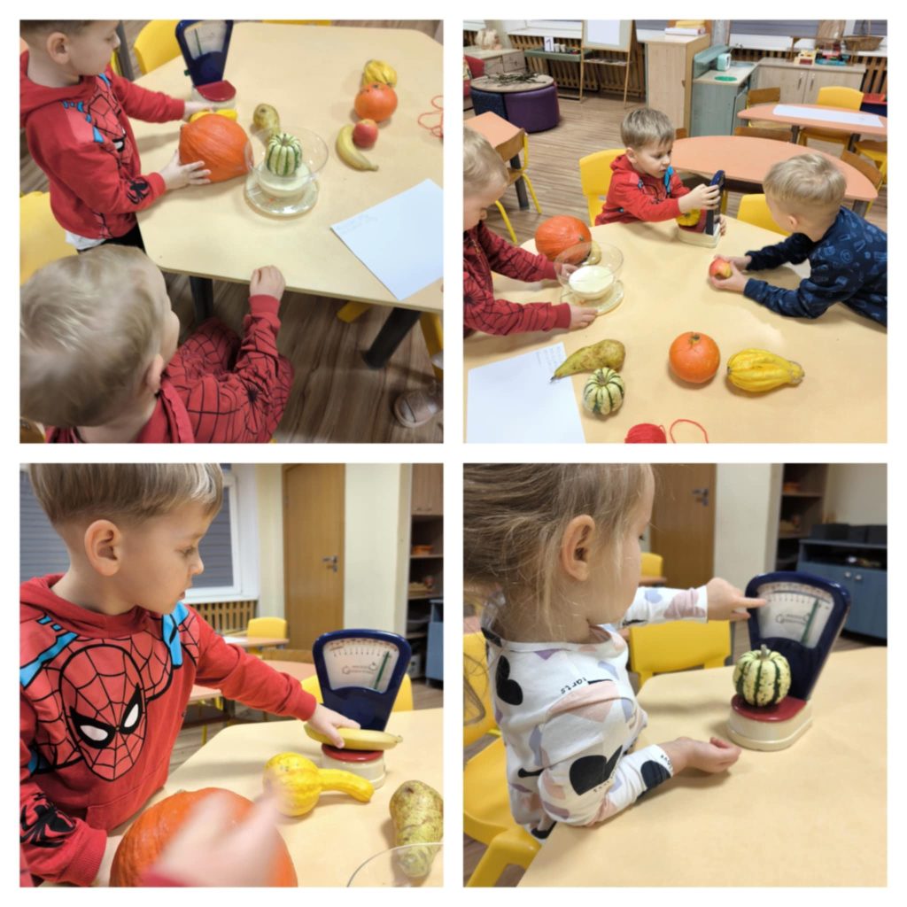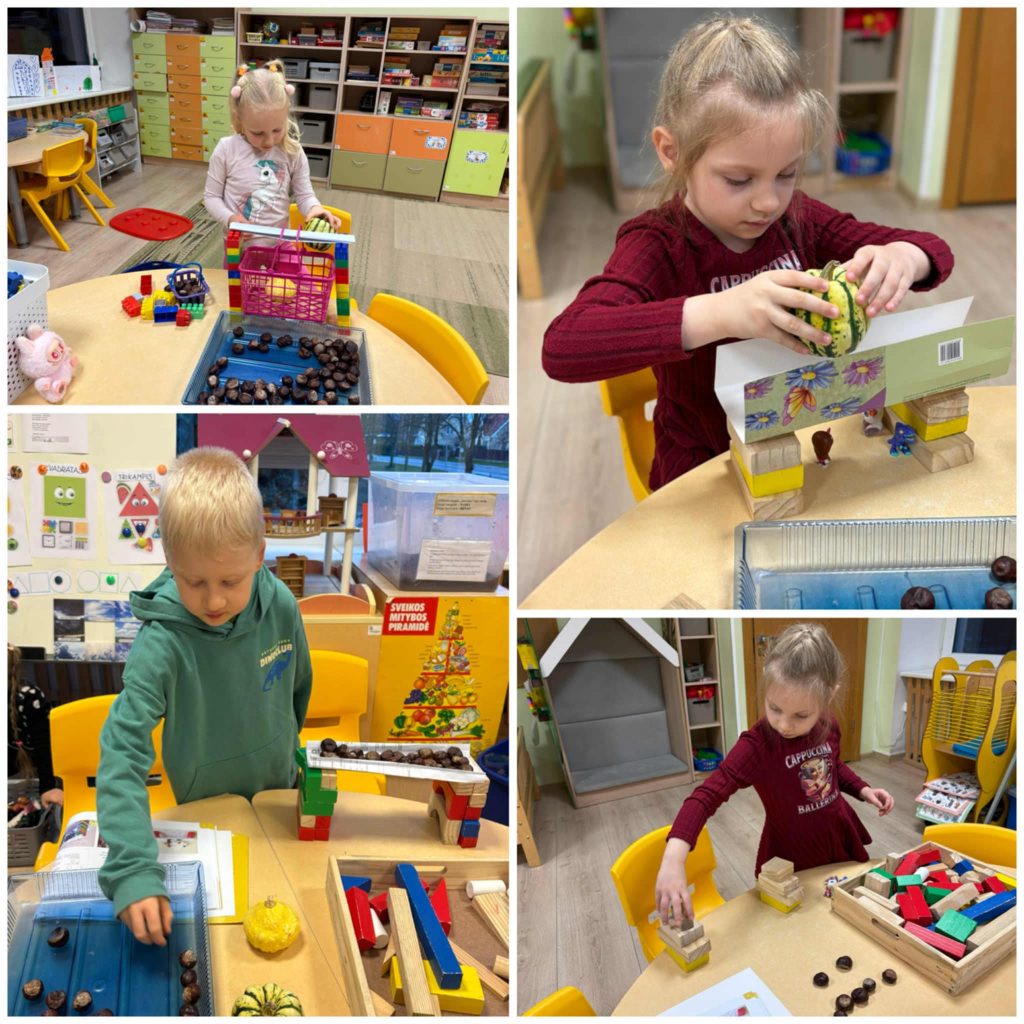 Susipažinę su matavimo ir svėrimo prietaisais, svėrė, matavo moliūgus, cukinijas. Bandė spėti, kieno daržovė bus sunkesnė, storesnė ar ilgesnė. Vaikai sugalvojo pastatyti statinius, kurių stiprumą bandė ant jų uždėdami įvairias daržoves. Taip išsiaiškino, kokie statiniai yra tvirtesni. Mažieji tyrinėtojai iš daržovių ir vaisių sukūrė ūgio matuoklę, dėliojo ir stebėjo, ko daugiau reikės – moliūgų ar obuolių? Apipiešdami moliūgo formą, ieškojo nuo mažiausio iki didžiausio moliūgo. Gamindami „Sveikos mitybos piramidę“ ugdytiniai išsiaiškino ir suprato, kiek reikia valgyti vaisių ir daržovių ir kokia didelė jų nauda žmogaus organizmui.