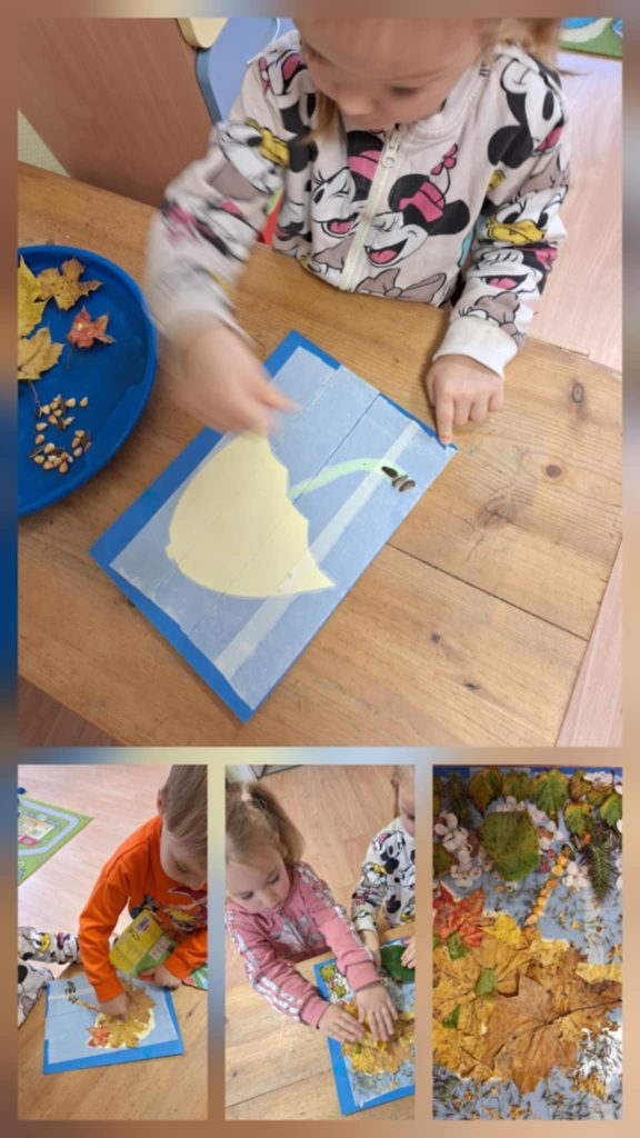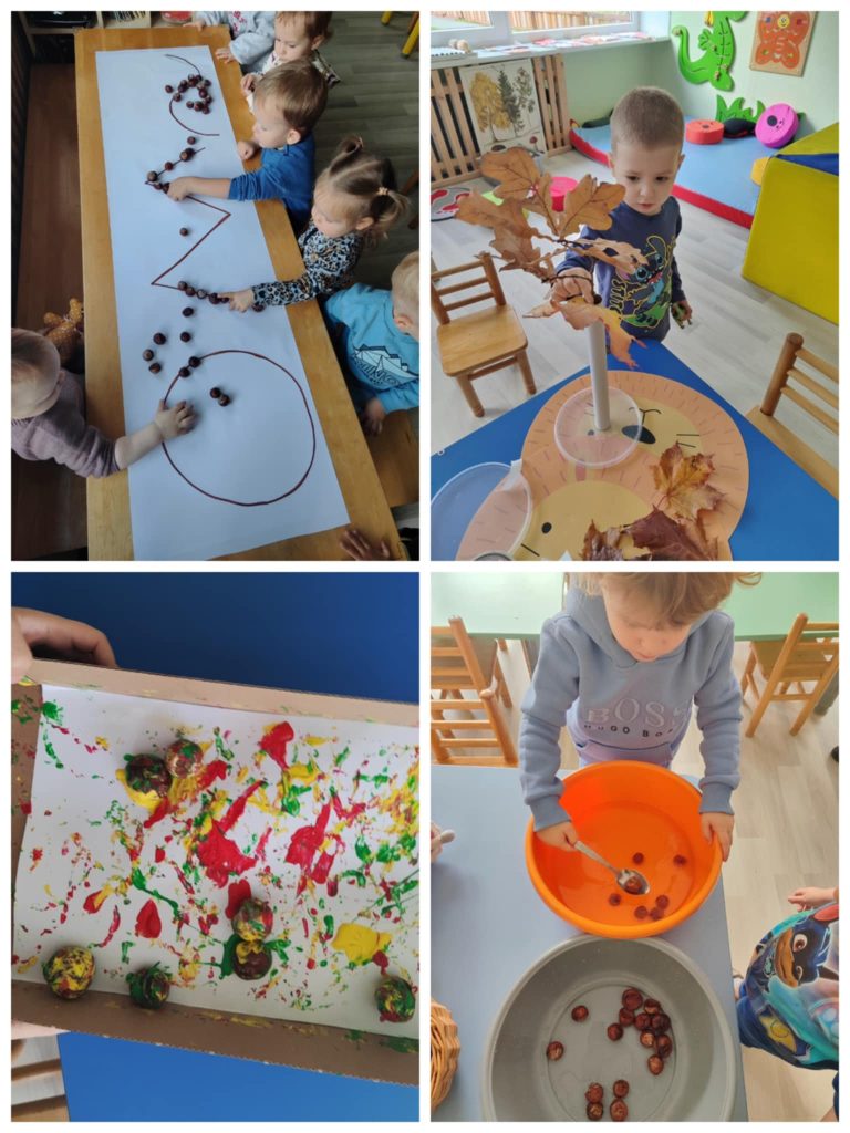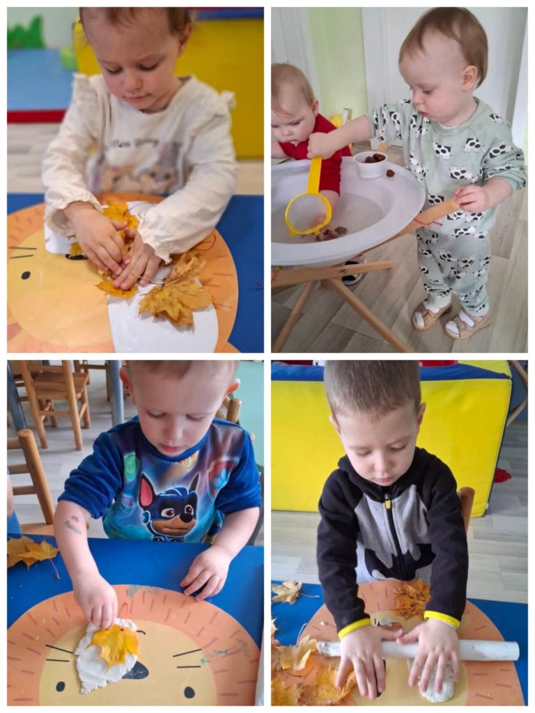 Spalio mėnesį vaikai susipažino su lauke augančių medžių lapų įvairove, sužinojo, kokios gėrybes užauginamos rudenį. Pasinaudodami gamtos teikiamomis priemonėmis vaikai ne tik mokėsi matematikos, tikslino gamtos pažinimo žinias, bet tuo pačiu lavino smulkiąją motoriką, kalbą. Mažieji tyrinėjo lapų sandarą, juos lygino pagal dydį, formą, dėliojo geometrines figūras iš kankorėžių, kaštonų, akmenukų, šakelių, rašė skaičius ant smėlio. Savaip dėliojo, kūrė ir augino rudeninius medžius, iš lapų sukūrė rudeninę žmogeliuko šukuoseną.